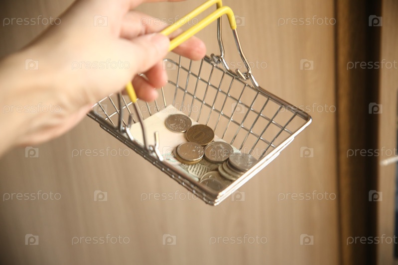 Женская рука держит маленькую корзину для покупок с деньгами рублями. Финансы и валюта