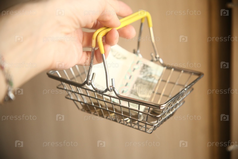 Женская рука держит маленькую корзину для покупок с деньгами рублями. Финансы и валюта