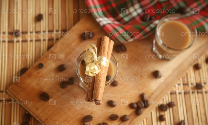 Алкогольный напиток ликер с корицей и кофейными зернами на столе. вид сверху