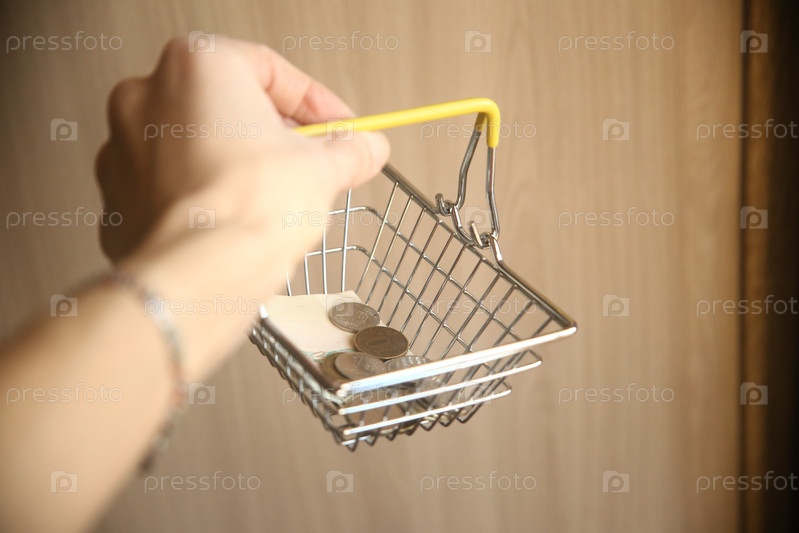 Женская рука держит маленькую корзину для покупок с деньгами рублями. Финансы и валюта