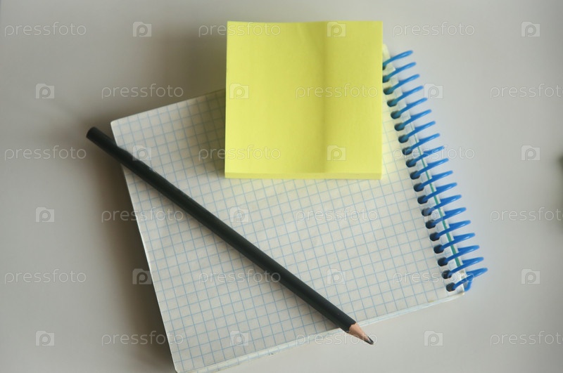 Канцелярские товары карандаш, стикеры и блокнот на белом фоне