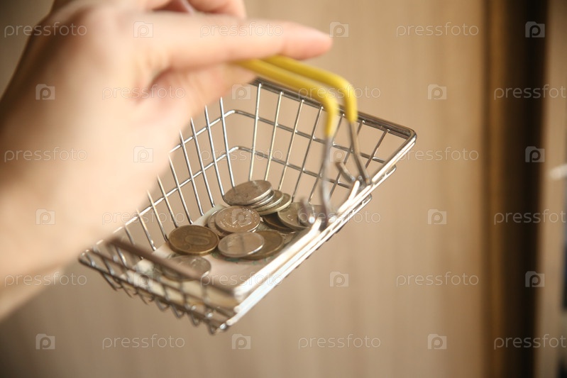Женская рука держит маленькую корзину для покупок с деньгами рублями. Финансы и валюта