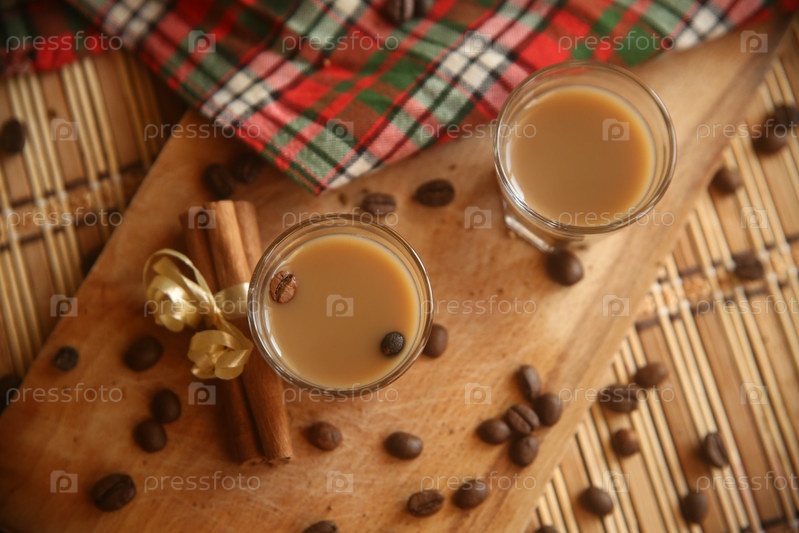 Напиток ликер с корицей и кофейными зернами на столе. Крупный план. Вид сверху