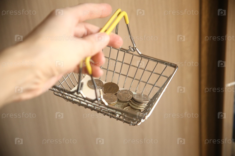 Женская рука держит маленькую корзину для покупок с деньгами рублями. Финансы и валюта