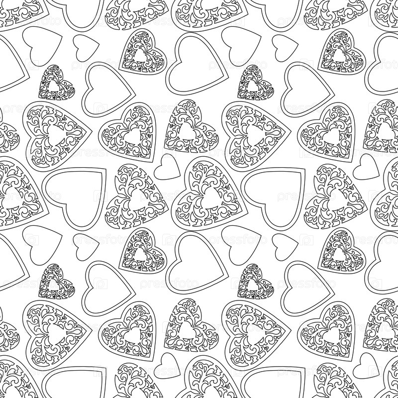 Контур векторного бесшовного узора с резными декоративными сердцами для красочной книги