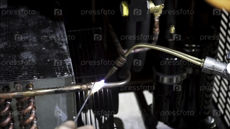 Работник использует газовый горелка и сварку для присоединения медных труб. Клип. Рабочий горелка нагревает детали. Металлический рабочий на фабрике, использующий трассу-горелки, чтобы разрезать кусок металла
