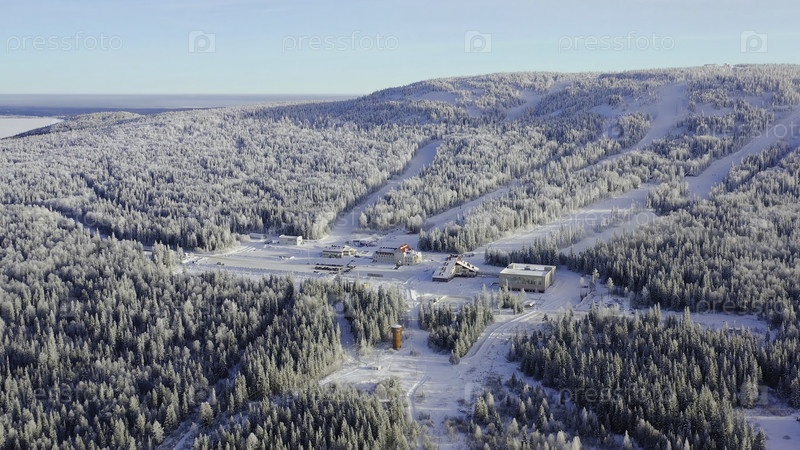 Вид с вершины горнолыжного курорта у подножия горы. Кадр. Уединенный горнолыжный курорт у подножия холма со лыжными трассами популярен в зимний сезон. Ясный солнечный день на лыжных склонах зимнего курорта