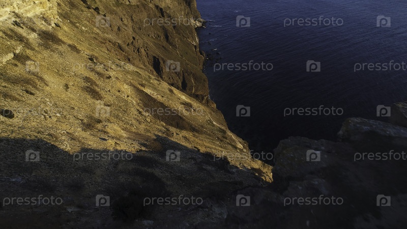 Вид с воздуха на скалистое спокойное побережье океана при закате.Снимок.Прекрасный вид с края обрыва на поверхности океана