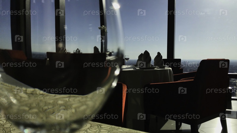 Вид на город, отраженный в бокале вина. кадры. вид на город из ресторана. ресторан в небоскребе с видом на город, стекло на переднем плане