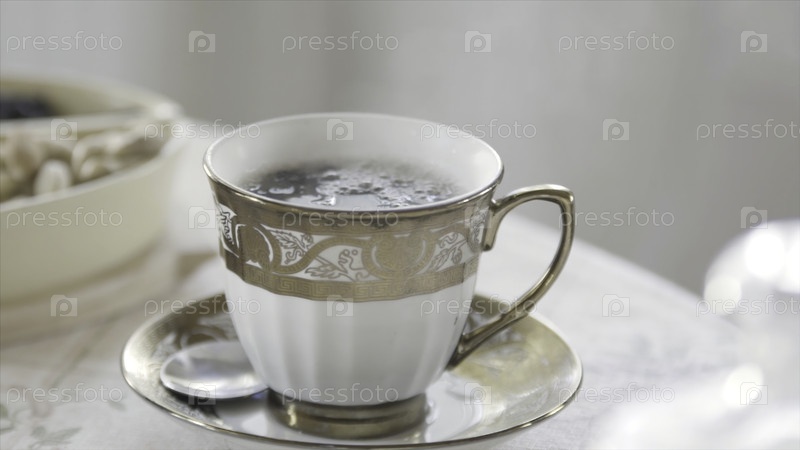 Ближайшее изображение элегантной фарфоровой чашки горячего чая с паром, стоящей на столе в светлой комнате