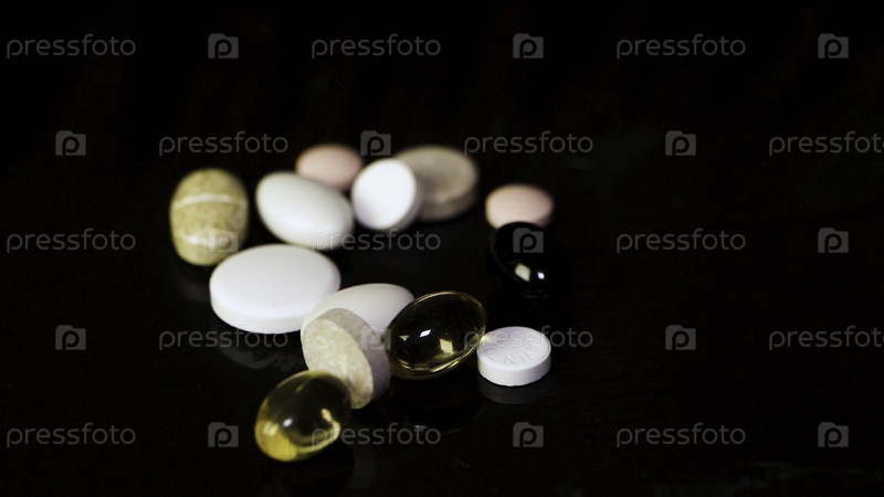 Фармацевтический фон на темном столе. Левитационные таблетки. Таблетки на темном фоне, которые падают вниз. Пилюли. Медикаменты и здоровые. Закрыть капсулы