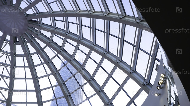 Стеклянный купол современного здания. Вид изнутри комнаты. Легкая конструкция прозрачной крыши, сделанная из круглых стальных труб. Архитектурный фон. Стеклянный купол изнутри на фоне небоскреба