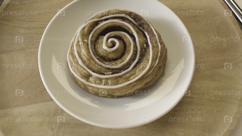 Ближайшее изображение сладкого булочного улитки, медленно вращающейся на фоне деревянного подноса и готовящей домашние выпечки