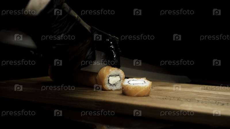 Руки в черных перчатках режут филадельфийский рулон острым ножом на деревянной доске, изолированный на черном фоне