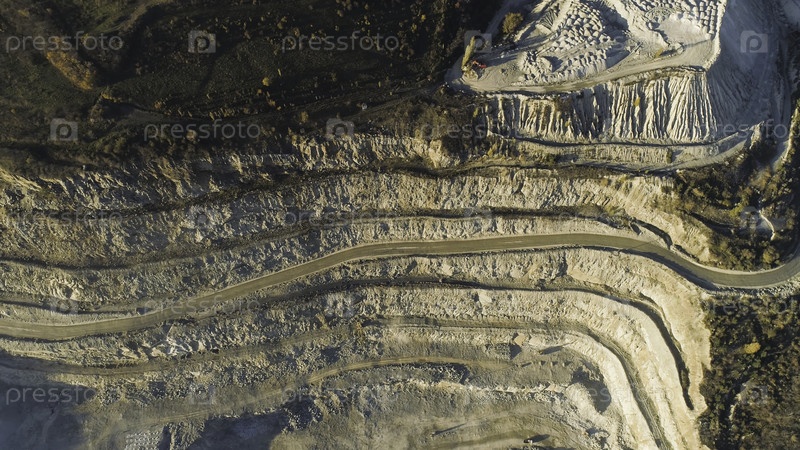 Панорамный вид на карьер. Снимок. Вид сверху живописного карьера, расположенного на прибрежной горе недалеко от деревни в лесу. Концепция добычи полезных ископаемых