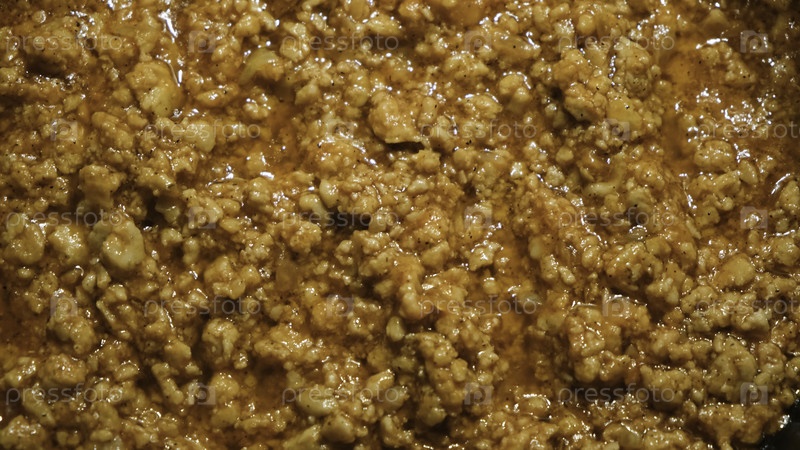 Близкий снимок мяса, приготовленного в соусе. Концепция. Молотое мясо хорошо жарено в большом количестве соуса на сковородке. Профессиональное приготовление соуса из молотого мяса с соусом