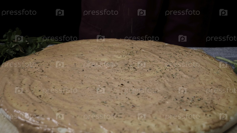 Руки готовят пиццу. Рамка. Кухарь на кухне кладет ингредиенты на пиццу. Концепция пиццы. Производство и доставка продуктов питания. Близкая рука шеф-повара в белой форме, готовящий пиццу на кухне