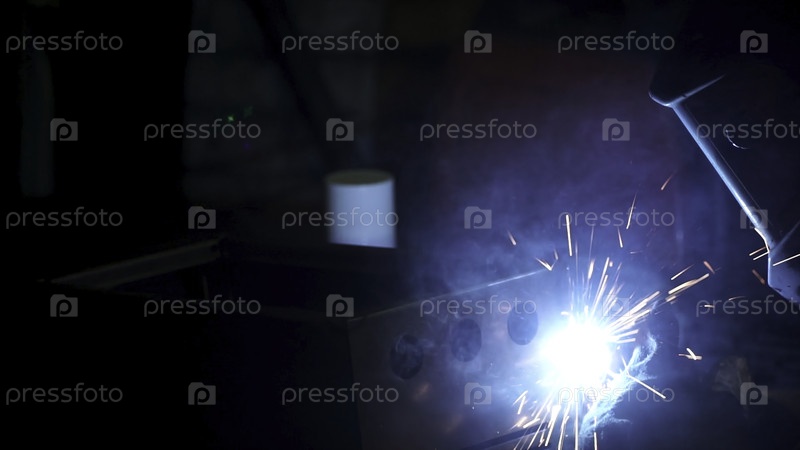 Сварка железа с ярким светом и дымом при производстве. Клип. Промышленный рабочий человек на фабрике, сваряющий вблизи дугой
