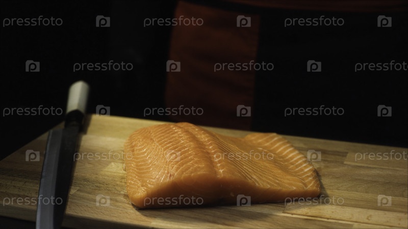 Профессиональный повар в черном фартуке и перчатках кладет кусок лосося на деревянную доску, прежде чем нарезать его для посуды