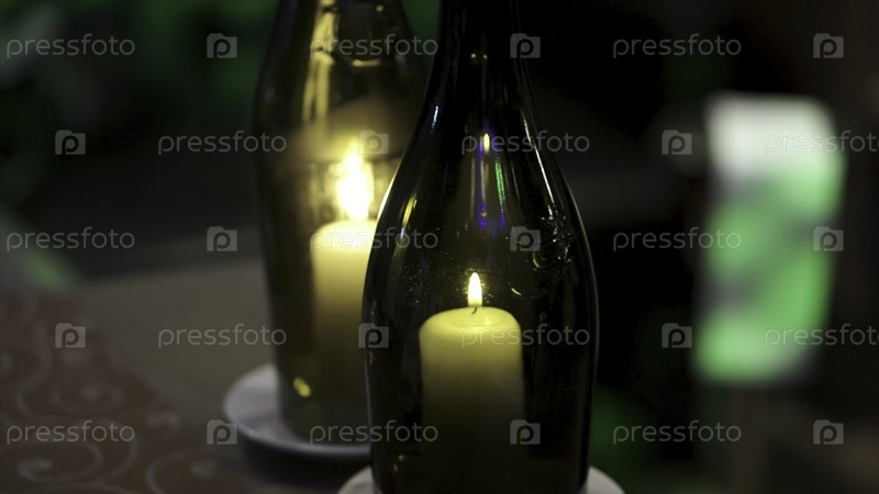 Декоративные бутылки с свечами внутри. Клип. Красивые стильные свечи в бутылках. Свеча горит в бутылках. Летнее домашнее украшение, стеклянная банка и бутылка, светодиодный огонь свечи внутри