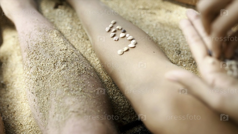 Женские руки собирают узоры ракушек и песка, ближайший снимок. видео. кусочки янтаря и моллюсков в женских руках на фоне песка. девочка играет с ракушками и песком сидя на пляже