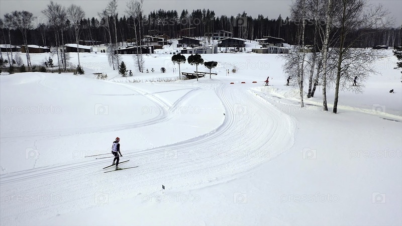 Спортсмены по горнолыжному спорту зимой. Кадр. Вид сверху профессиональных лыжных спортсменов, тренирующихся на лыжной трассе в зимний период