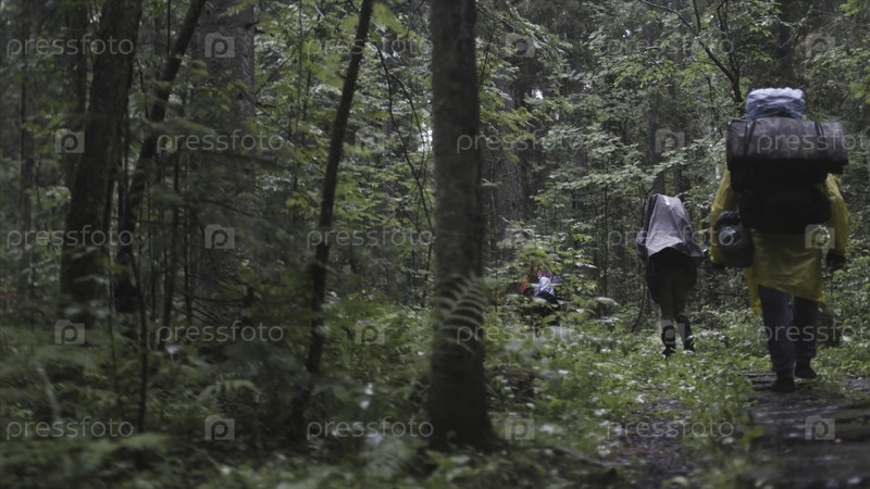 Сзади изображение группы людей с рюкзаками, путешествующих вместе и взбирающихся по лесу. Файлы кадров. Приключения, путешествия, туризм, концепция походов, друзья гуляют по лесу