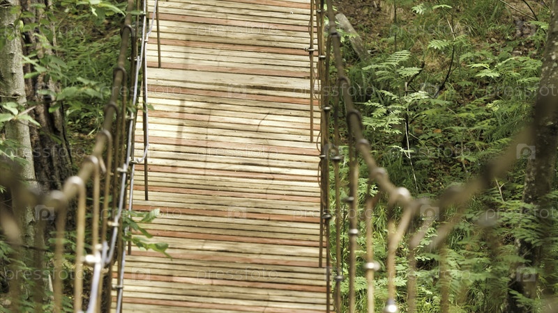 Вид на пустой деревянный подвесный мост в лесу Национального парка, Танзания.Красивый деревянный висячий мост колеблется после ступеней