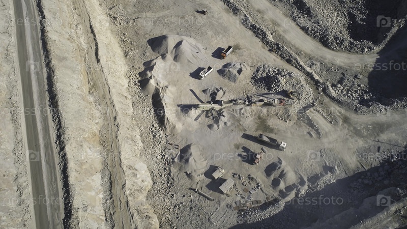 Вид сверху песчаного карьера с экскаваторами.Снимок.Операции по добыче в открытом грунте с работающими экскаваторами.Концепция горнодобывающей промышленности