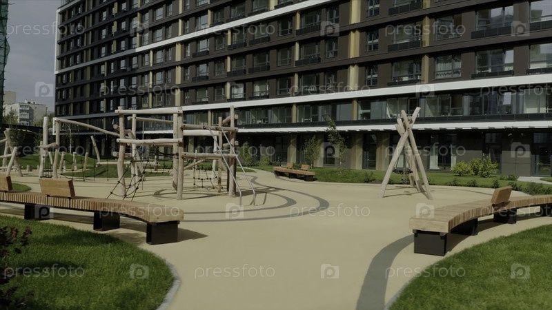 Летний пейзаж с пустой современной игровой площадкой в новом современном жилом комплексе. видео. детская деревянная игровая площадка с многоэтажным домом на заднем плане