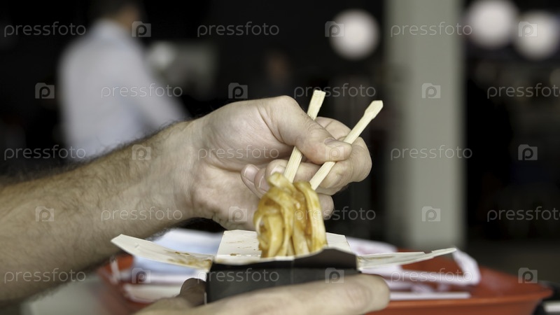 Ближайшее изображение мужских рук с помощью деревянных китайских палочек, которые едят вкусные азиатские лапши вока