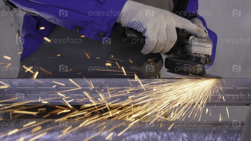 Ремесленник, пилящий металл с помощью дисковой мельницы в мастерской. Металлическая шлифовка с летящими искрами. Электрическое измельчение колес на стальной конструкции на фабрике Низкоскоростное жалюзи. Металлическая шлифовка с оранжевыми летающими искра