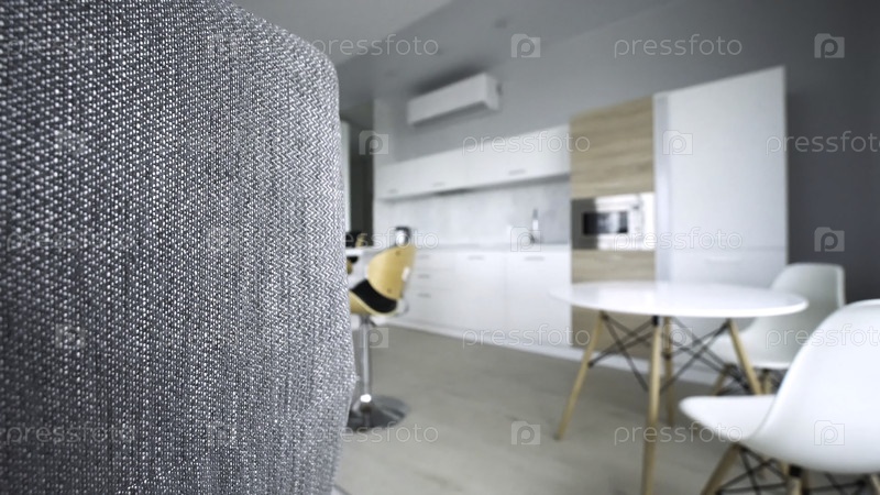 Современная небольшая комната с кухонной зоной и деревянным полом