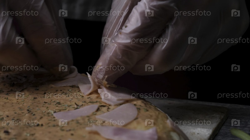 Приготовление пиццы в замедленном режиме. Рамка. Изготовление пиццы с сыром, томатной пастой, колбасой и горчицей. Работа повара. Повар устраивает куски сосисок и пиццы с сыром и томатной пастой. Полный процесс распыления измельченного сыра, нарезания мяс