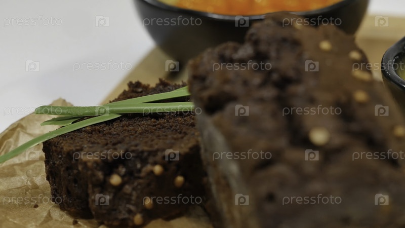 Кубок красной икры со ложкой, подаваемый с нарезанным хлебом, маслом и травами на белом фоне