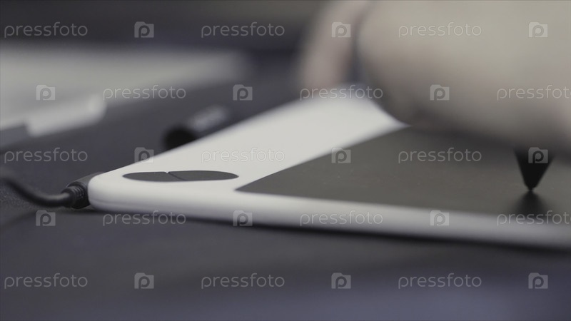 Близкий снимок женской руки с помощью электронной ручки во время работы в современном офисе с планшетом.Графический дизайнер работает и рисует иллюстрацию на планшете