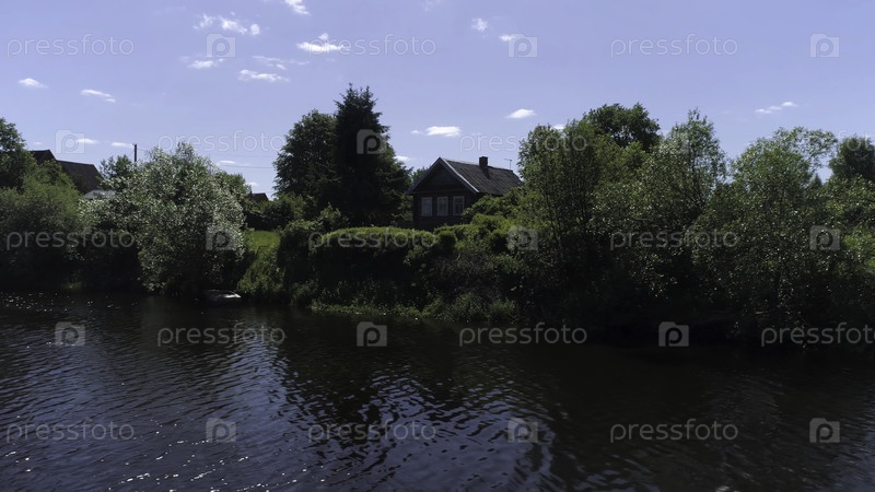 Деревня с деревянным домом, построенным на берегу пруда.Снимок.Экологическое место для жизни, маленький дом, зеленые деревья и деревянная лодка, пришвартованная недалеко от побережья