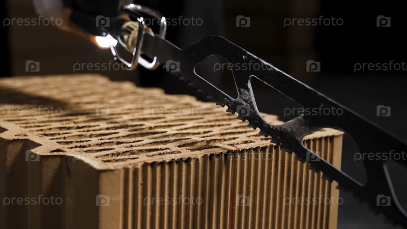 Ближайшее изображение электрической режущей машины для небольших керамических блоков, включающейся перед вырезанием. Скриншоты. Рабочий использует автоматическую пилу для резки керамических блоков