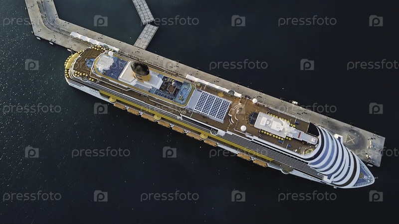 Вид сверху круизного лайнера возле пирса со стаей птиц, летящих над палубой. Сток. Аэрофотосъем комфортабельного пассажирского круизного судна на фоне синего моря