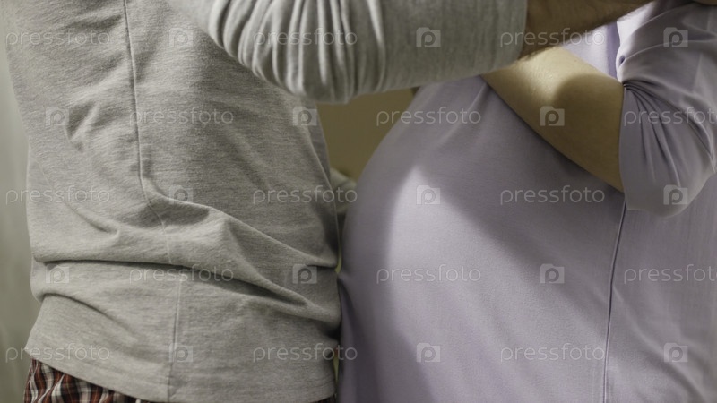 Любящий муж нежно обнимает свою беременную жену.Счастливая семья в ожидании рождения ребенка