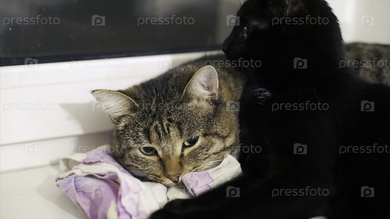 Два красивых кота греются на солнце на подоконнике.Клип.Два кошки дома на подоконнике