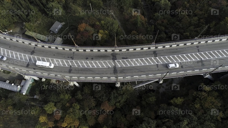 Вид сверху на эстакаду с движущимися автомобилями, морем и красивым пейзажным фоном