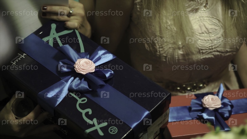 Женщины держат в руках ремесленную подарочную коробку.Клип.Молодые женские руки, держащие подарковую коробку с лентой.Женщина держит подарки на день рождения