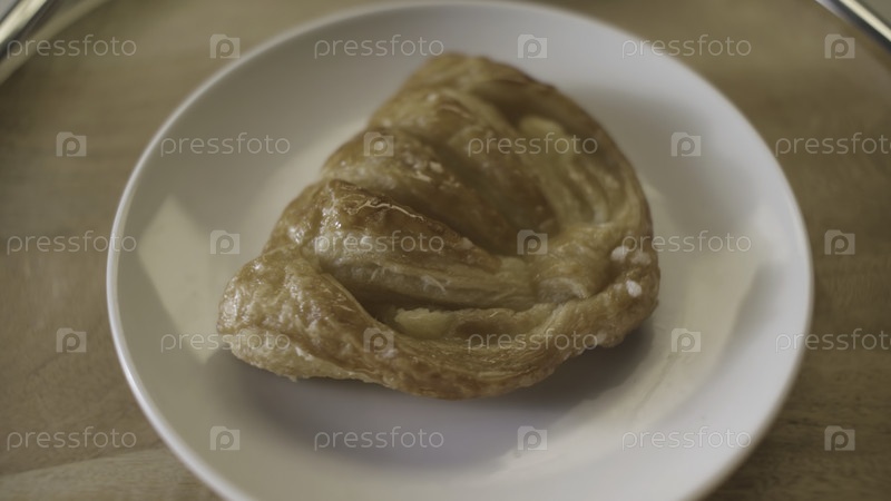 Ближайшее изображение сладкой булочки, лежащей на белой стеклянной тарелке и вращающейся