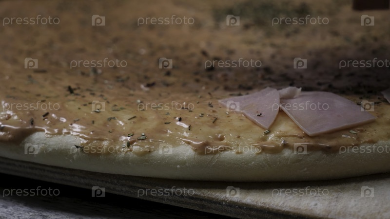 Приготовление пиццы в замедленном режиме. Рамка. Изготовление пиццы с сыром, томатной пастой, колбасой и горчицей. Работа повара. Повар устраивает куски сосисок и пиццы с сыром и томатной пастой. Полный процесс распыления измельченного сыра, нарезания мяс