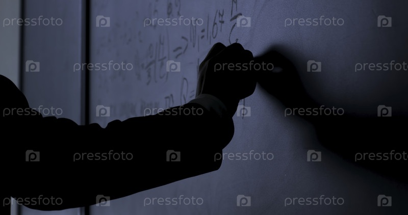 Ученый, пишущий формулы на черной доске.Рука с мелом написала формулы физики на черной доске крупнометражный снимок 4K