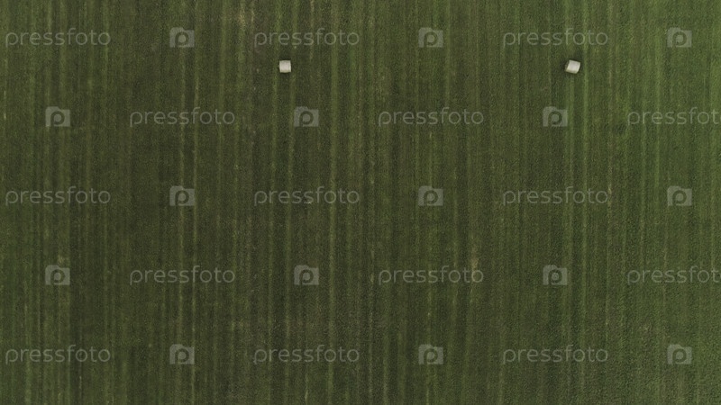 Вид с воздуха на сельский ландшафт со свежим зеленым полем и сухими балями сена во время урожая. вид сверху линий троп на сельскохозяйственных угодьях, концепция сельского хозяйства