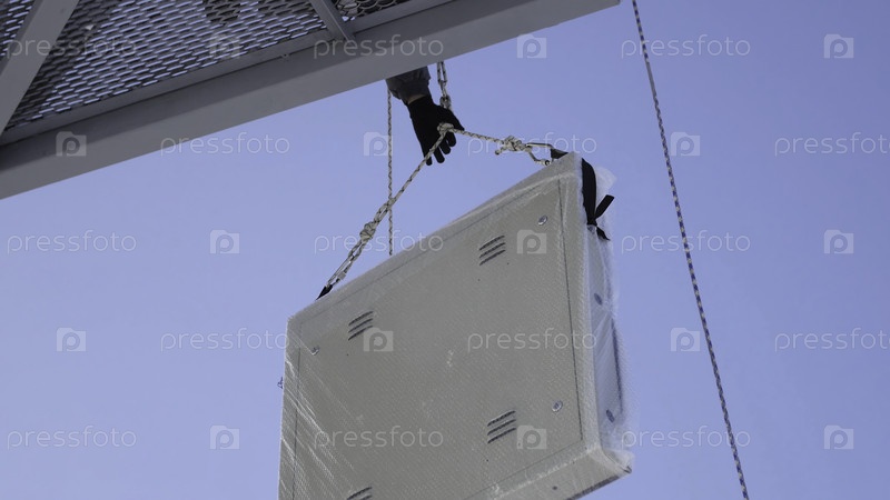 Мужчины собирают билборд на кране. Строитель на лифтовой платформе на строительной площадке. Человек поднимается в верхнюю часть Билборда для рекламы