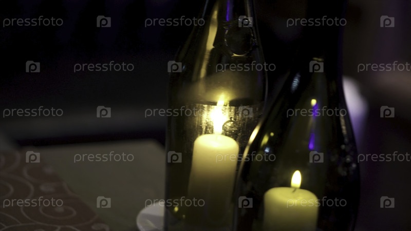Декоративные бутылки с свечами внутри. Клип. Свечи внутри маленькой бутылки. Летнее домашнее украшение, стеклянная банка и бутылка, светодиодная свеча пламя света внутри