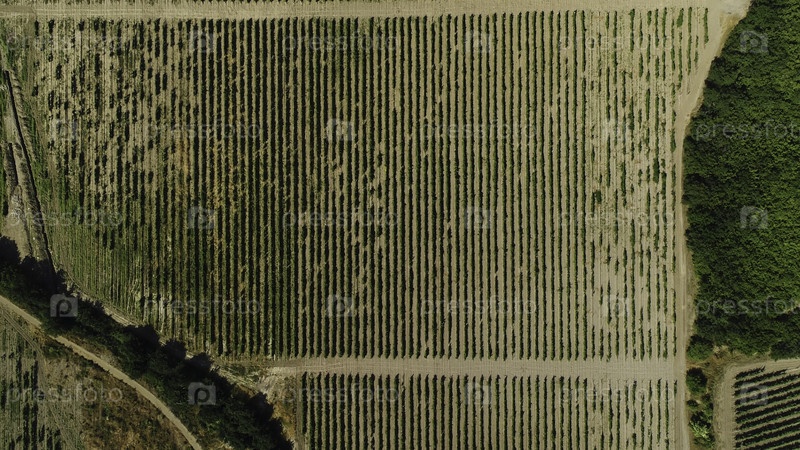 Вид сверху из воздуха от летающего беспилотника земли со посеянными зелеными полями в сельской местности весенним днем. Снимок. Земля с выращенными растениями возле зеленых деревьев